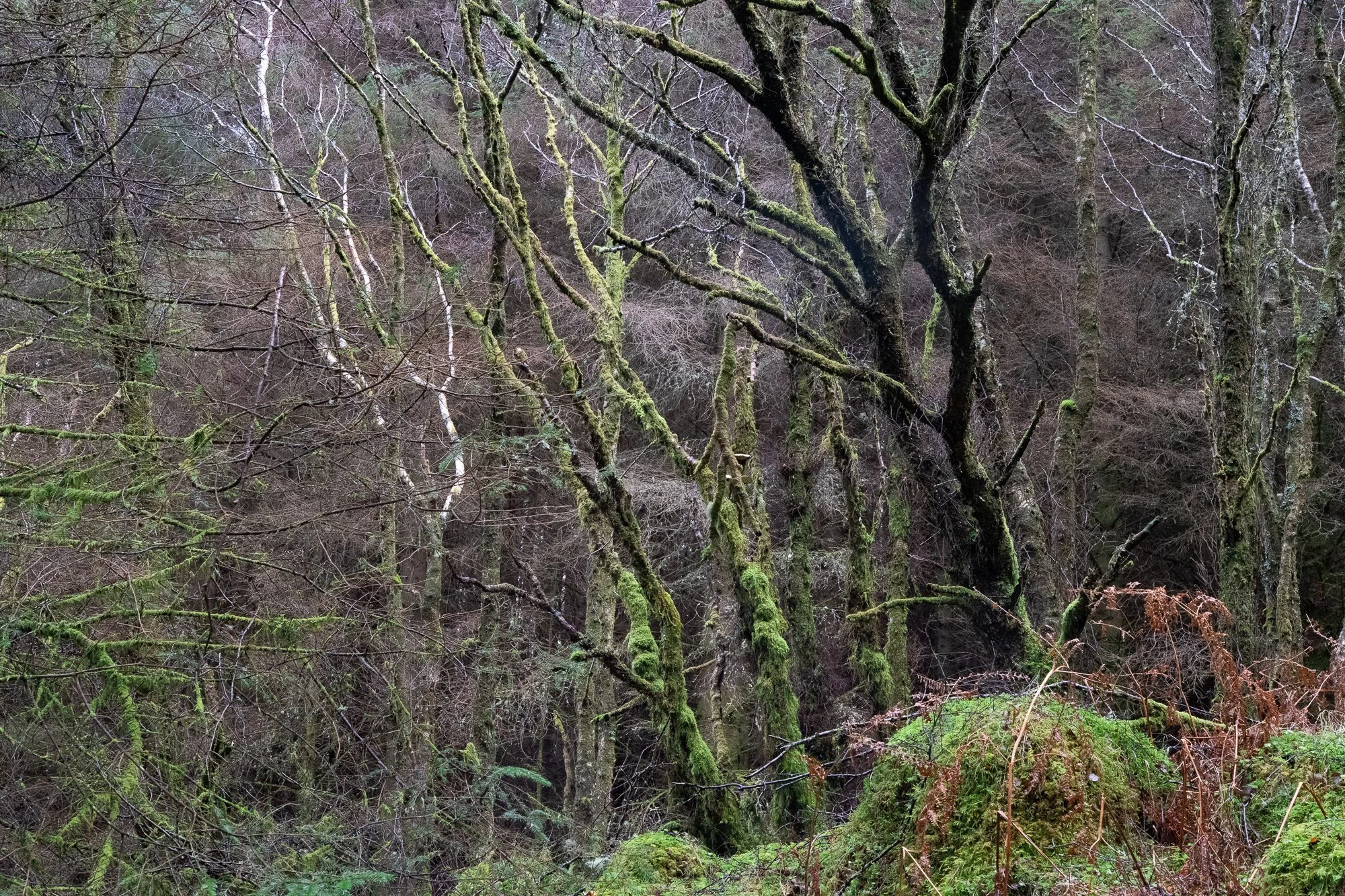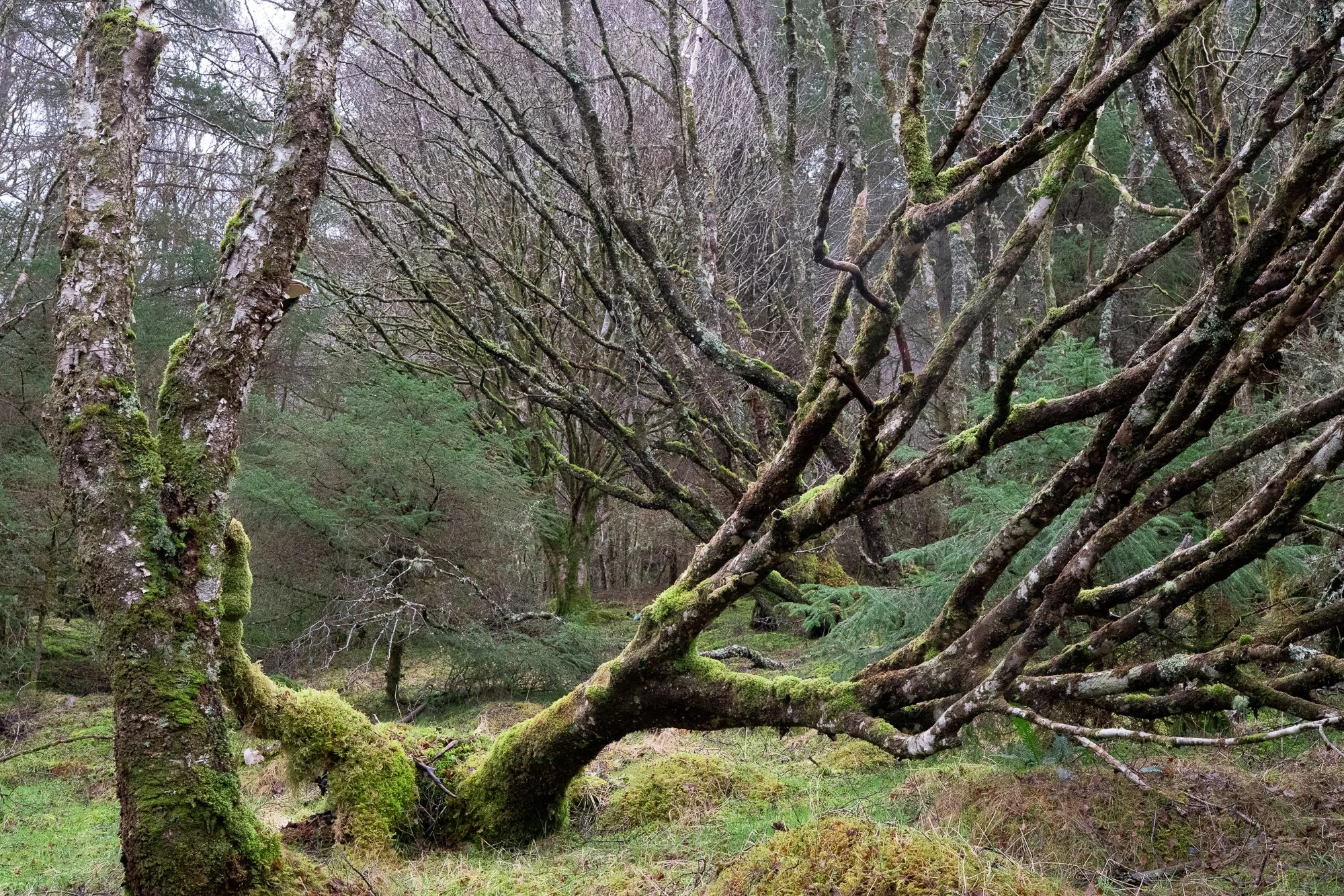 Wind-shaped trunks and moss-covered limbs create a natural architecture within the Highland woods. A contemplative fine art Scottish landscape print.