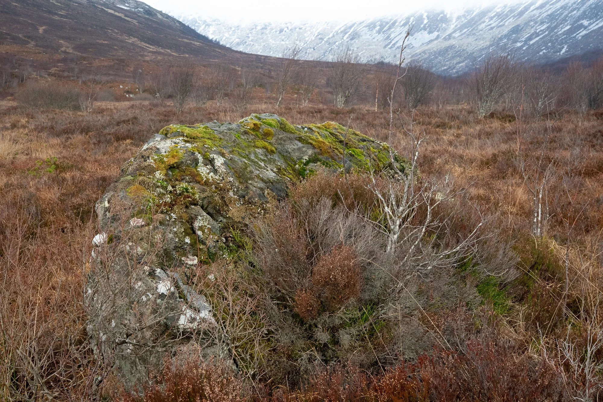 A weathered boulder rests among heather and moorland beneath snow-lined peaks — a grounded, elemental fine art Scottish Highlands print.