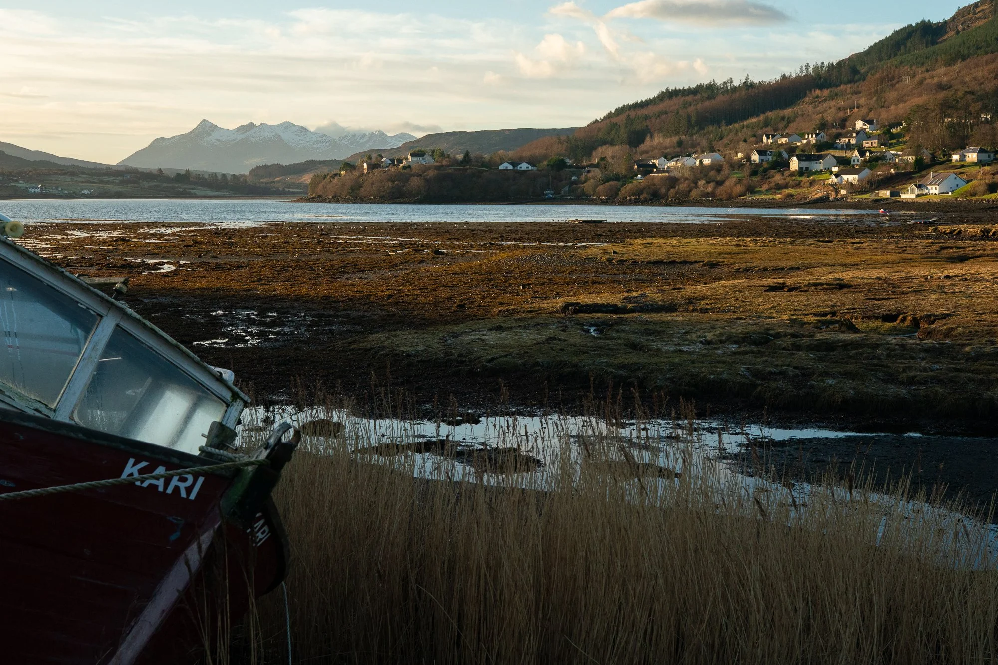 A red boat rests at low tide while a Highland village catches late light across the water. A subtle fine art Scottish Highlands print blending land and livelihood.