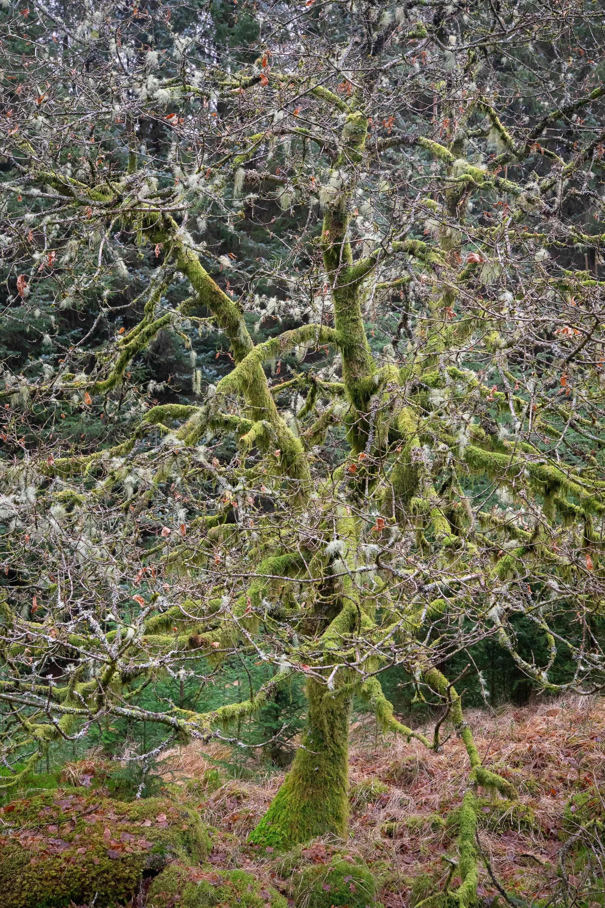 A portrait of a Highland tree wrapped in lichen and moss — textured, intricate, and rooted in place. A refined fine art Scottish Highlands print.