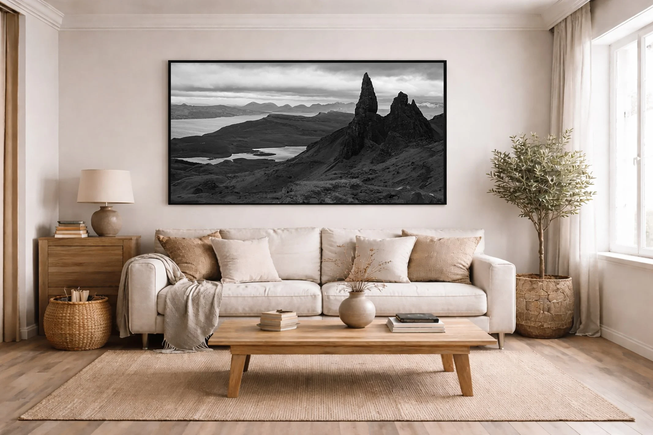 The neutral tonal range of the Scottish Highlands — stone, moss, sea, muted sky — integrates naturally into contemporary interiors. When printed at scale, these landscapes introduce atmosphere and depth without overwhelming a room.
