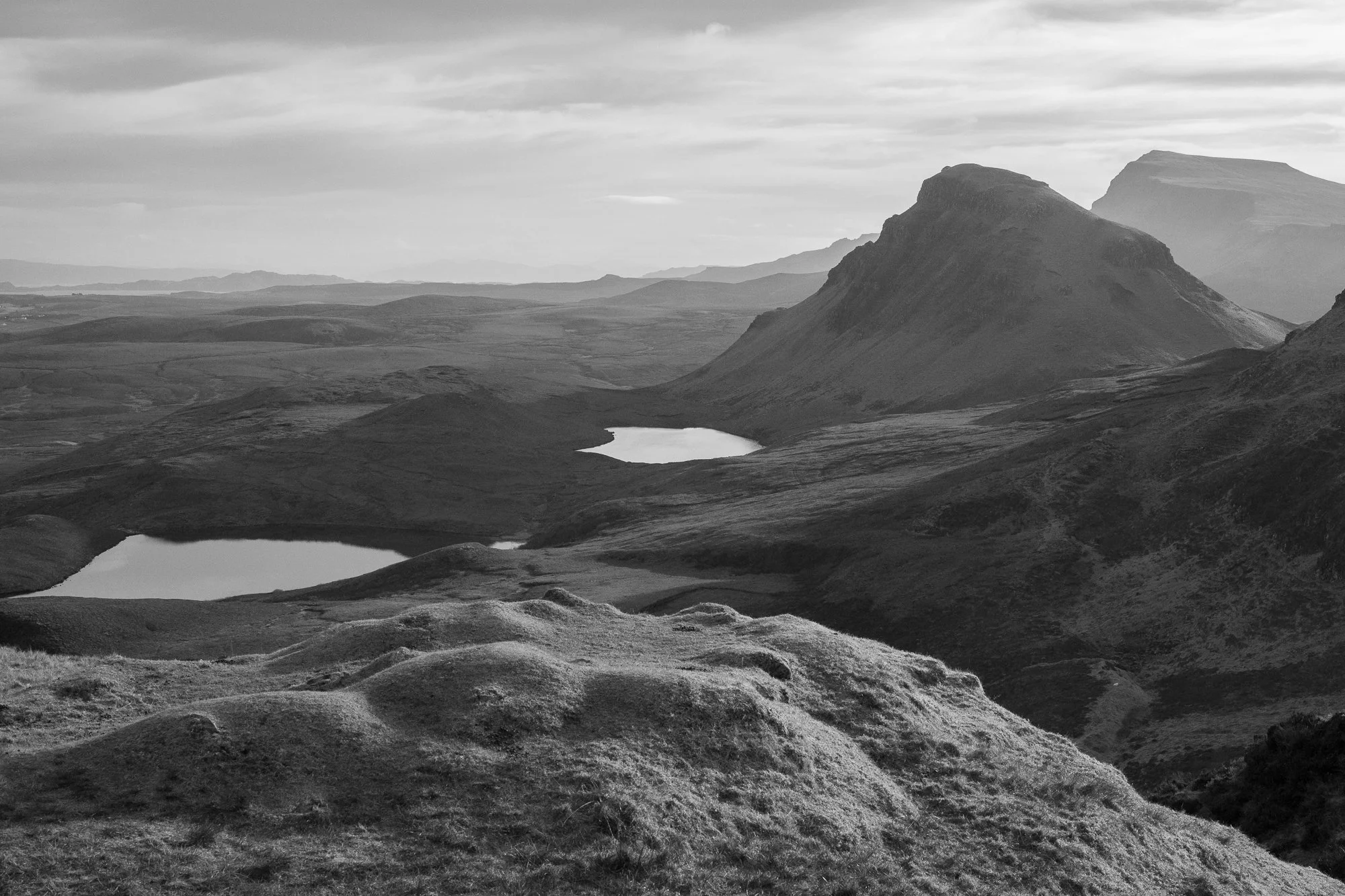Light traces across hills and lochs in this restrained black and white interpretation of the Scottish Highlands. A contemplative fine art print.