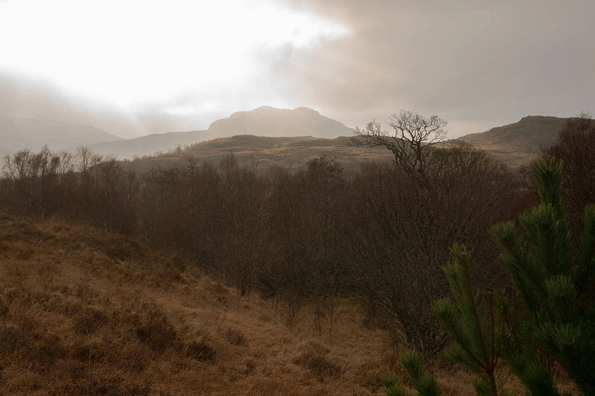 Beyond Skye, the wider Highlands soften into rolling hills, distant lochs, and weather moving across open ground. The palette shifts toward muted browns, moss greens, and low-contrast skies. These photographs balance isolation and scale — land that feels expansive without being dramatic for its own sake.