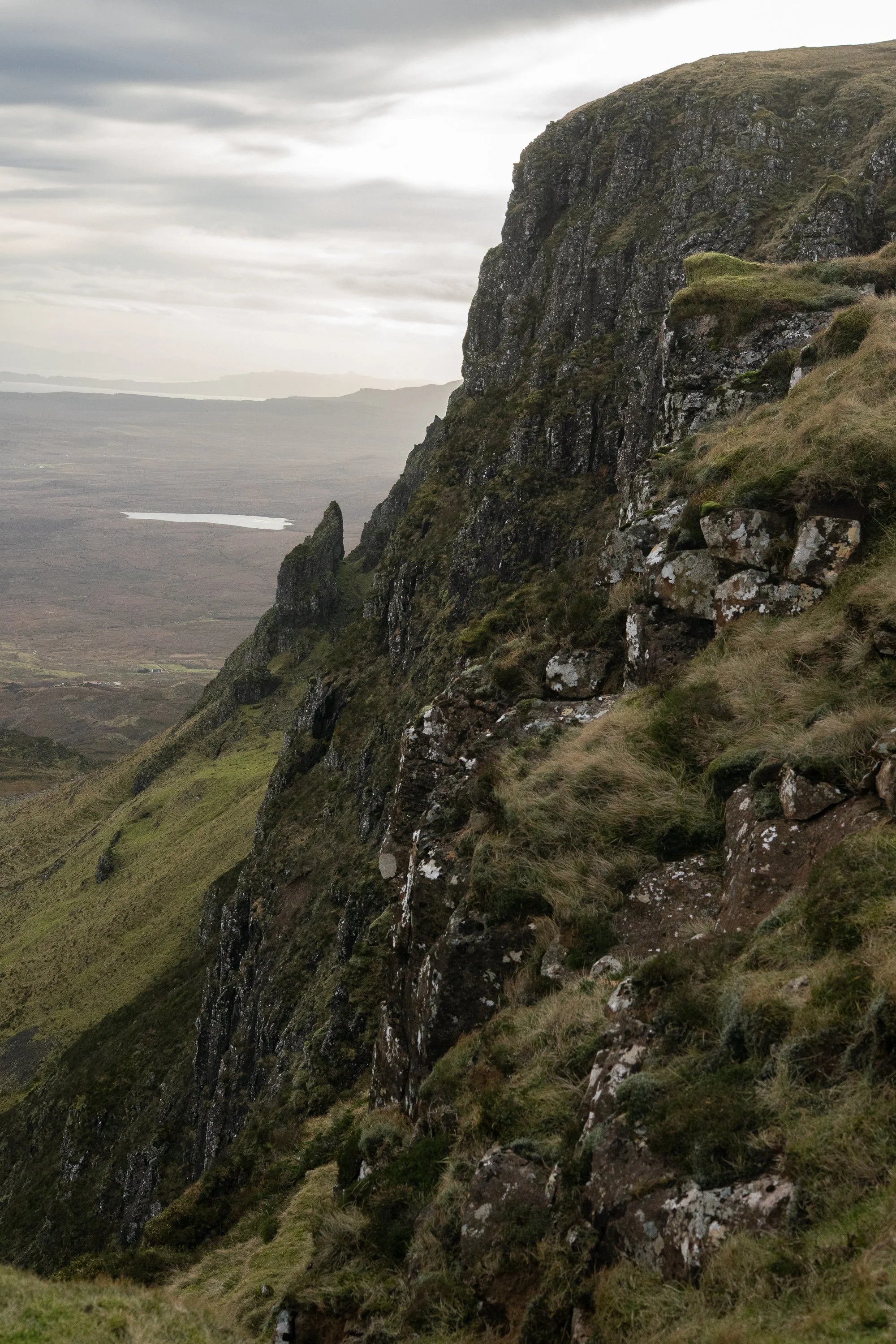 A sheer cliff drops into open moorland and distant water, emphasizing the raw geology of the Highlands. A museum-quality fine art print.