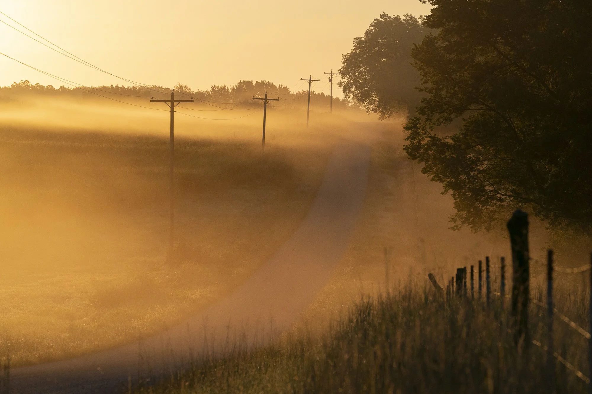 Golden light burns through morning mist on a rural road lined with telephone poles