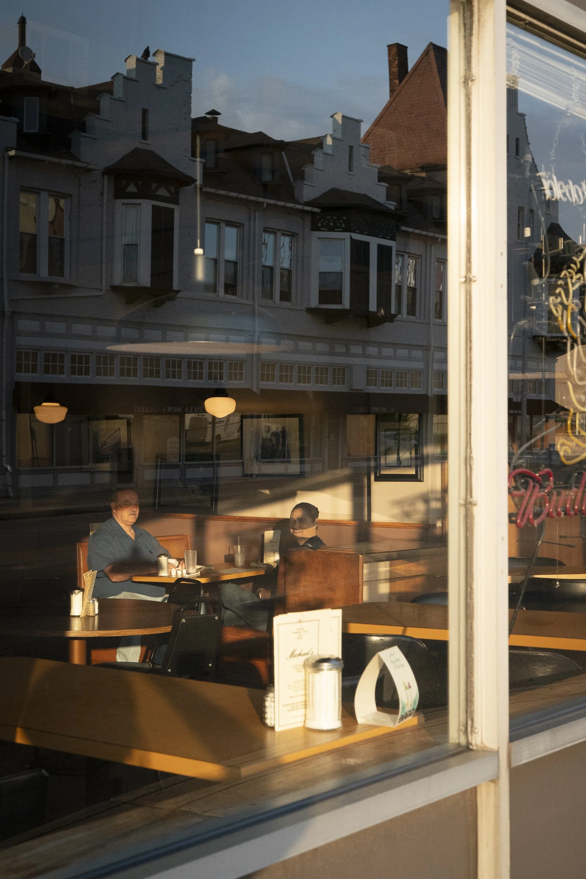 A man and woman sit inside a café, their reflections mingling with the architecture across the street