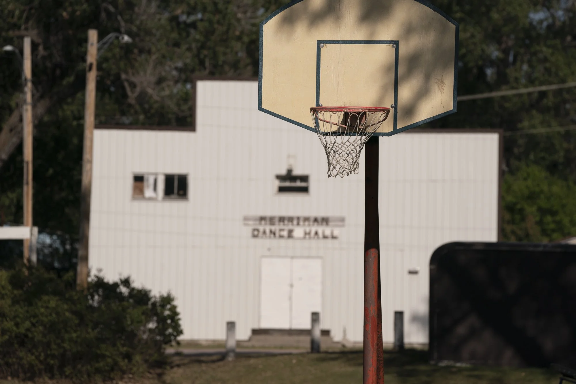 An old basketball hoop in front of Merriman Dance Hall, where sport meets community tradition.