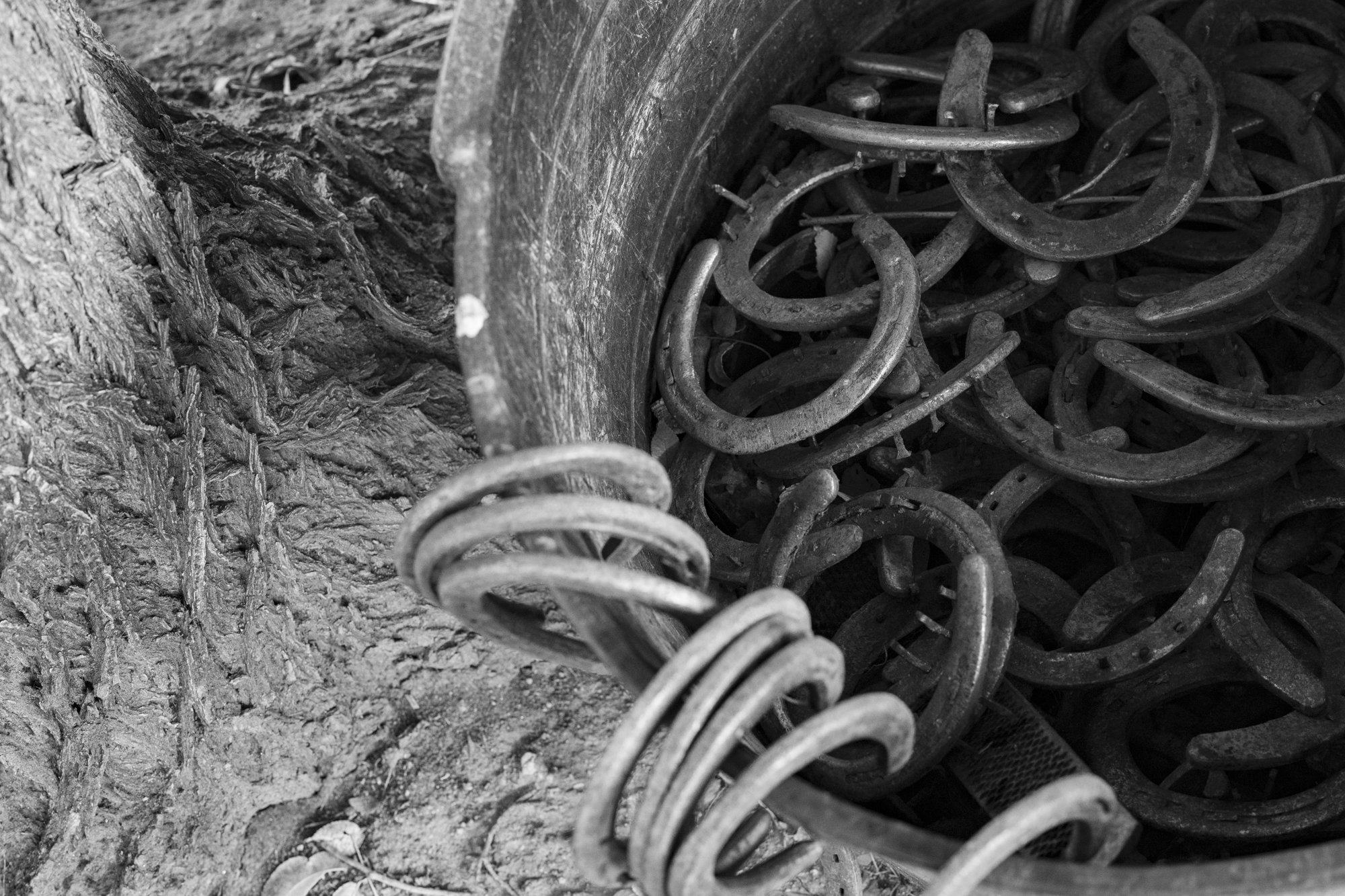Part of the process left in the dirt beside a steel post. Ranch work carries physical consequences — not symbolic ones.