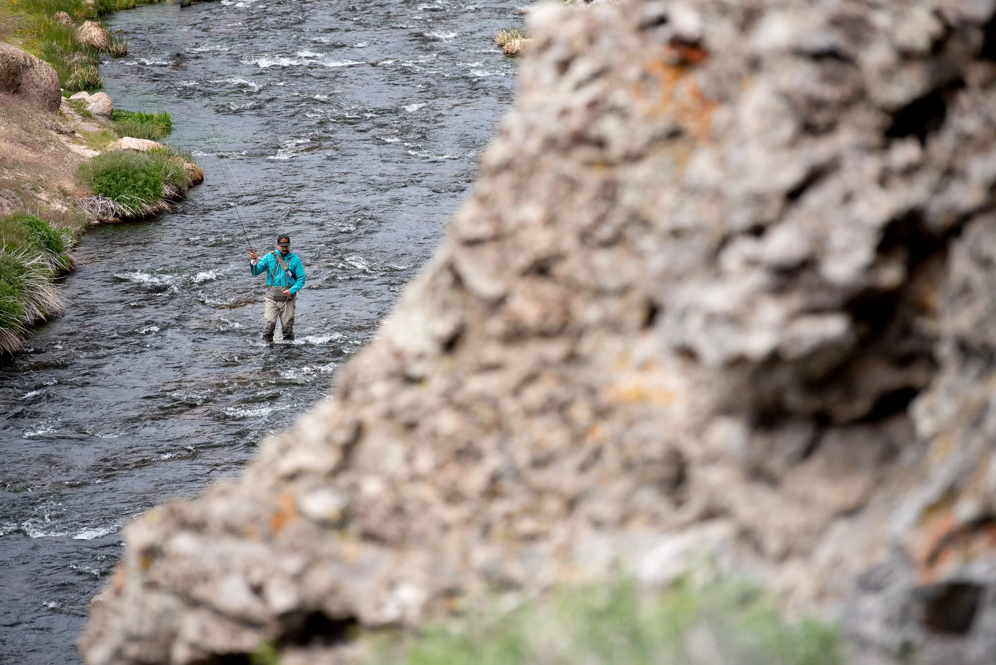 Fly fishing on Hot Creek surrounded by large rock cliffs