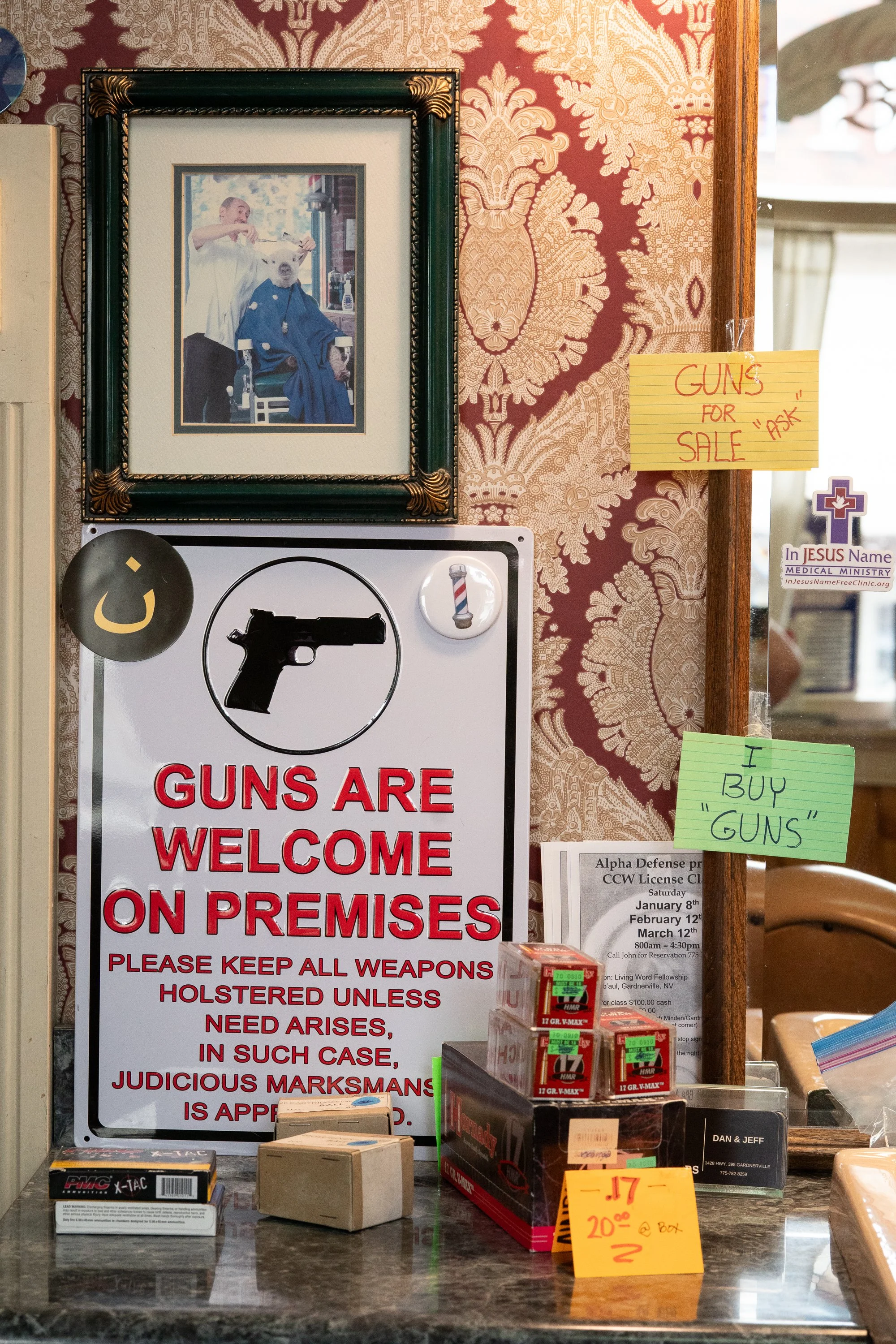 A detail that stops you in your tracks—ammo for sale on the barbershop counter, a reminder that these shops often reflect the character of the towns they serve.