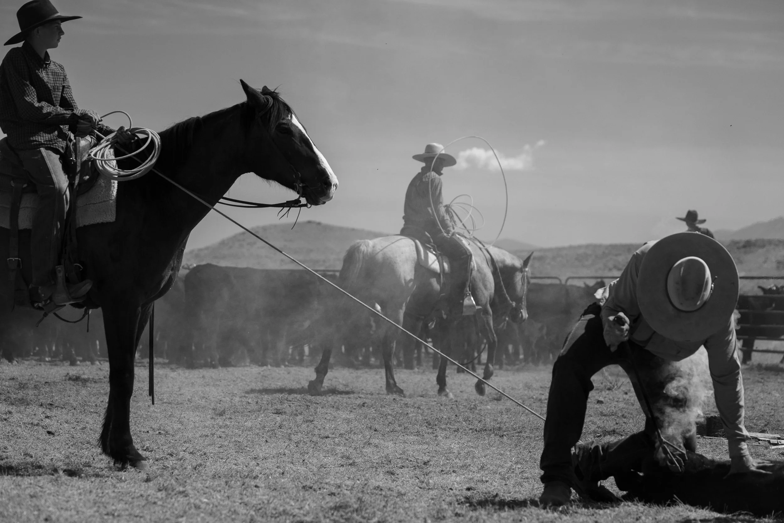 Cowboys roping cattle on the C-Punch Ranch in Lovelock, Nevada
