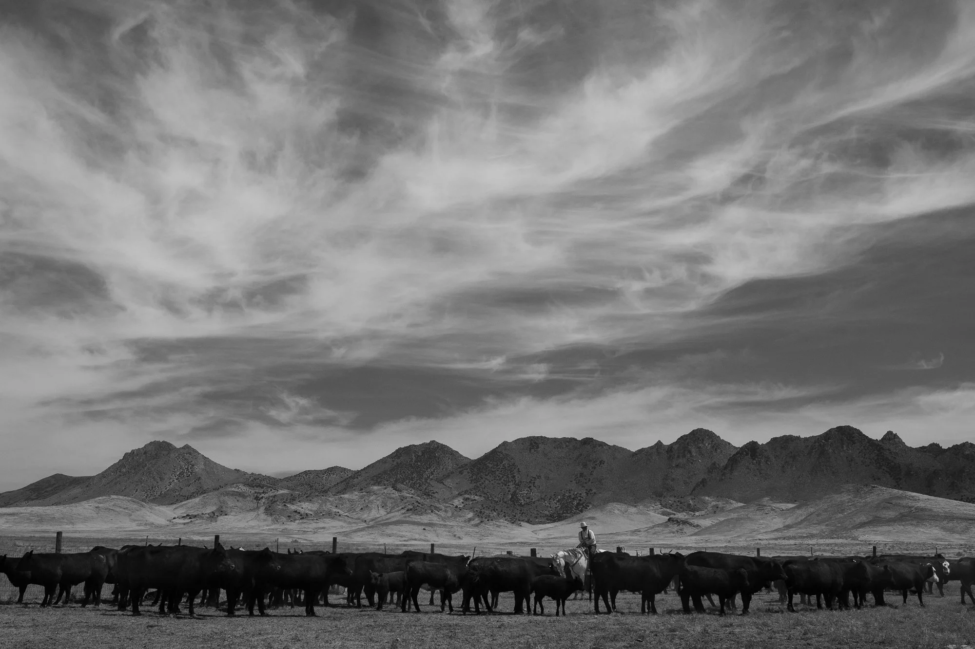A cowboy drives cattle beneath a sweeping sky at the C-Punch Ranch, framed by the rugged mountains of northern Nevada.