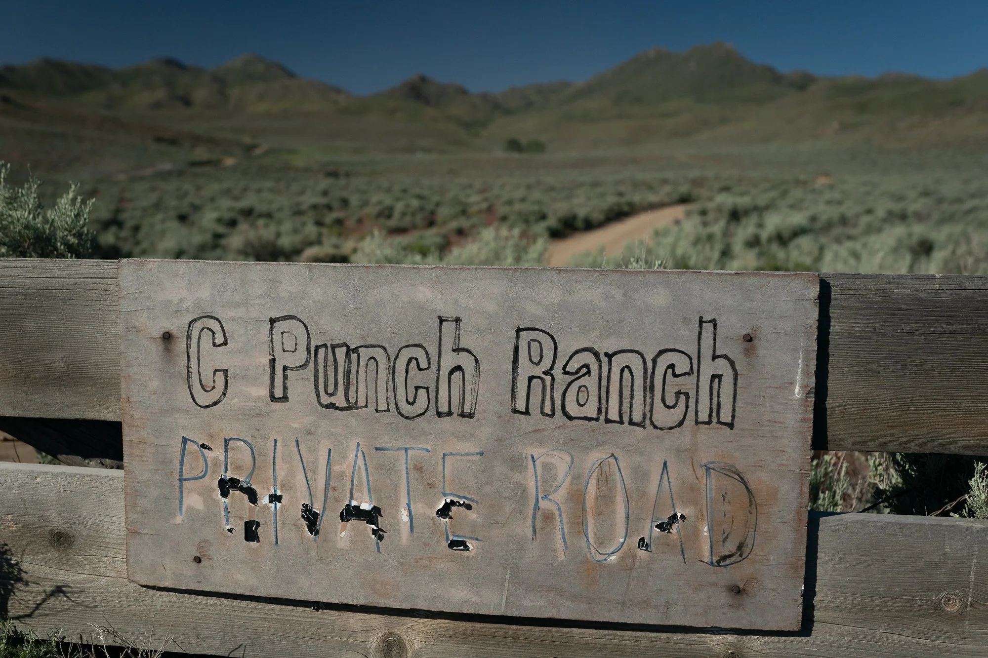 The hand-painted sign at the entrance to the C-Punch Ranch, marking the start of a long dirt road that winds deep into the sagebrush country of northern Nevada.