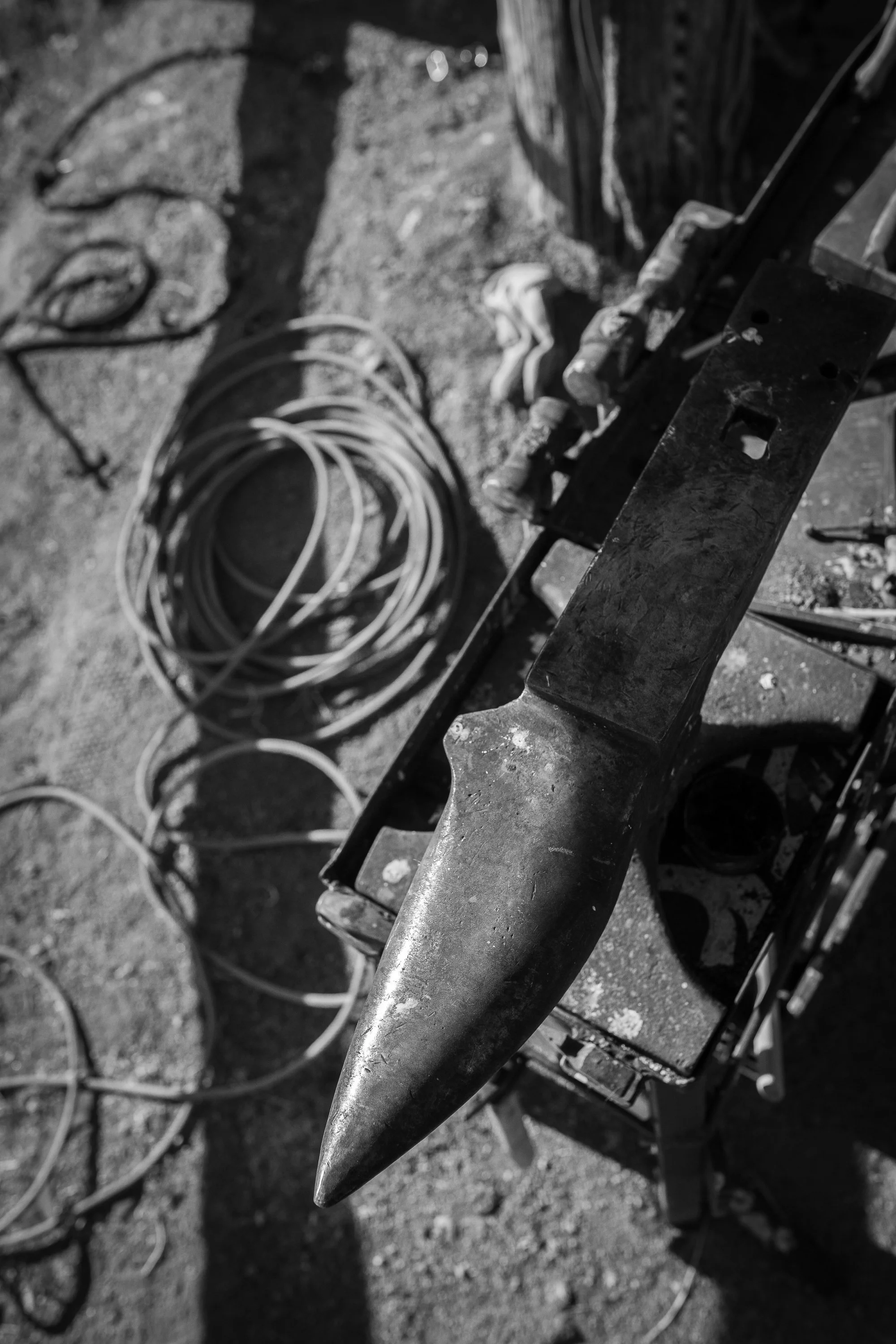 Anvil and ropes at the C-Punch Ranch, showing the worn metal and dust of daily work during branding season.