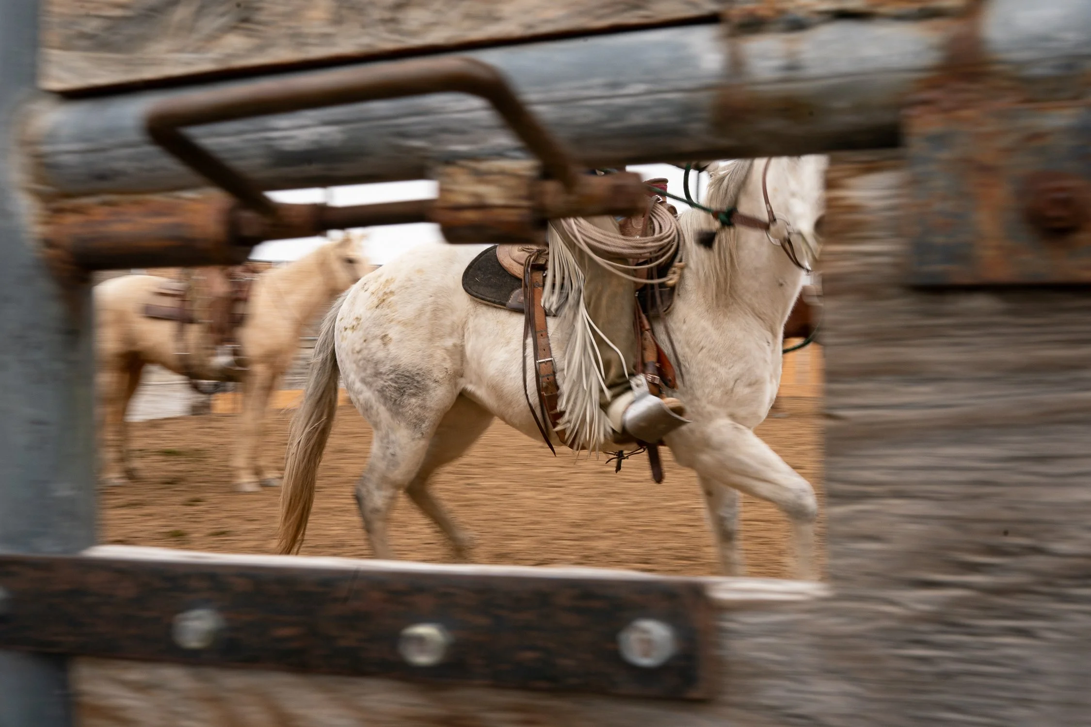 A fleeting glimpse of a saddle horse moving through the corrals during morning work at the C-Punch Ranch.