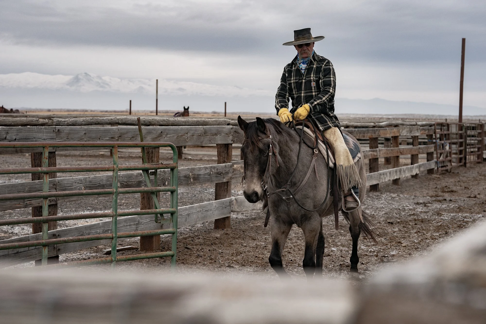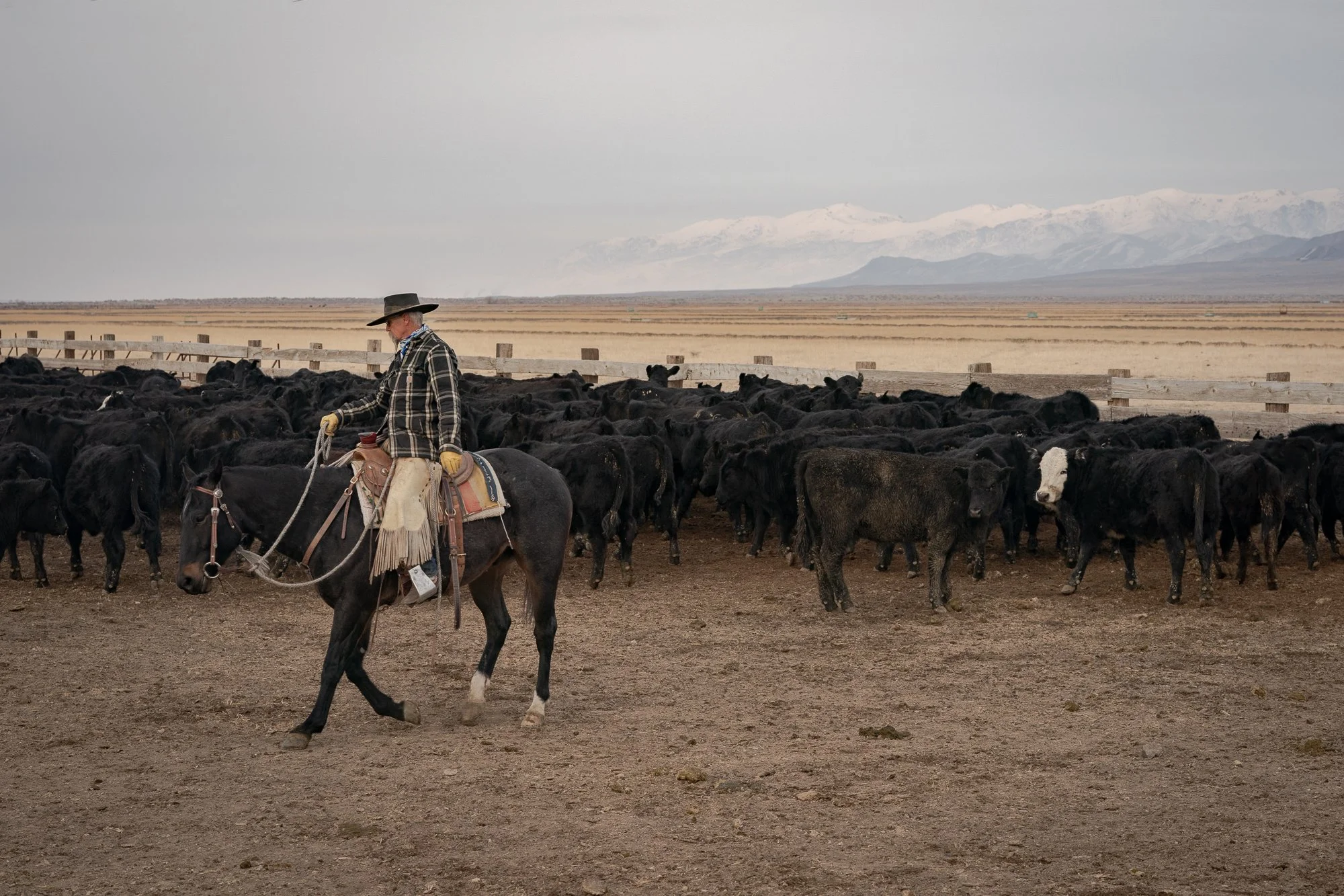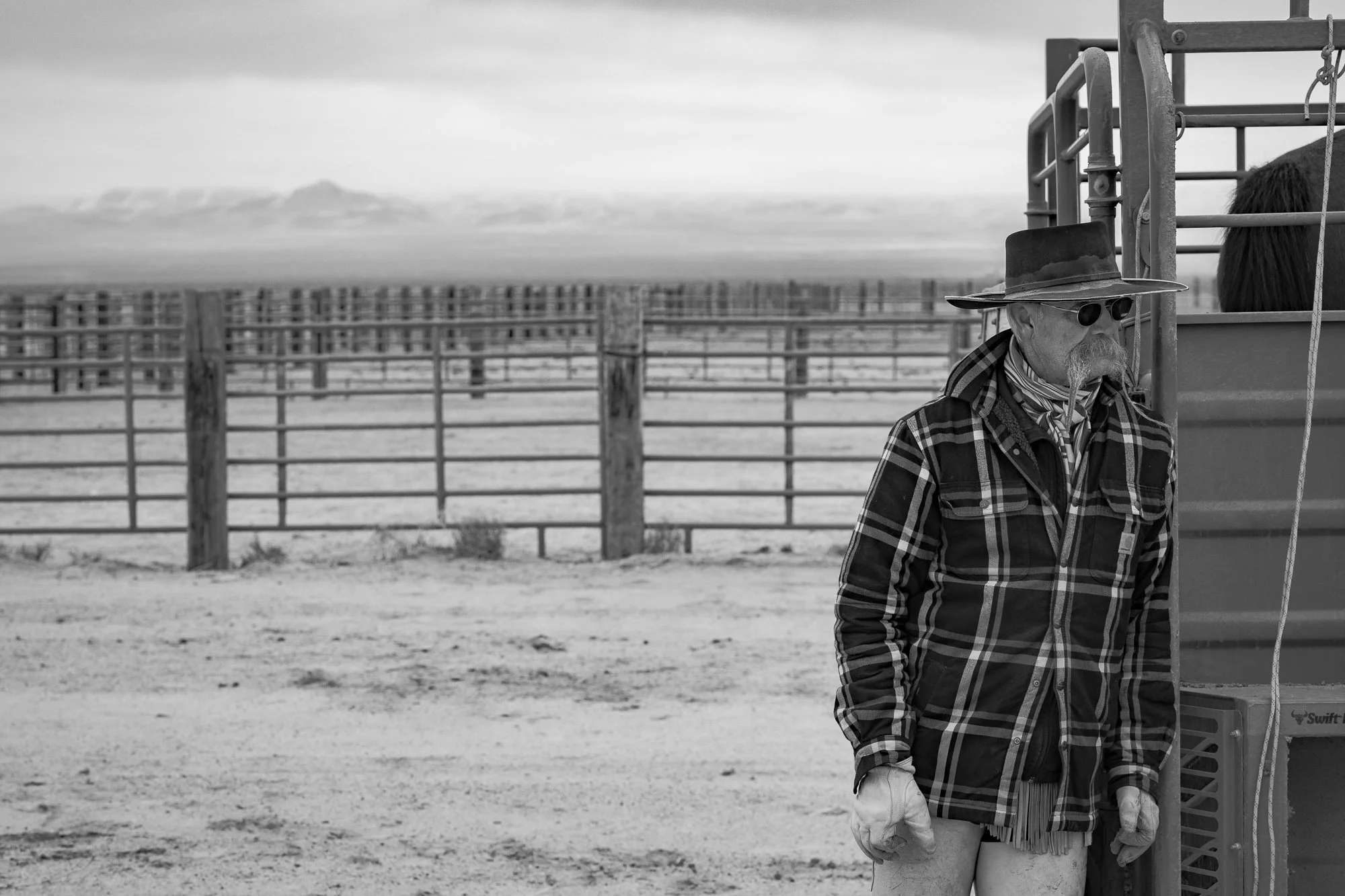 A seasoned buckaroo waits by the chutes at the C-Punch Ranch, preparing for another day of winter cattle work.