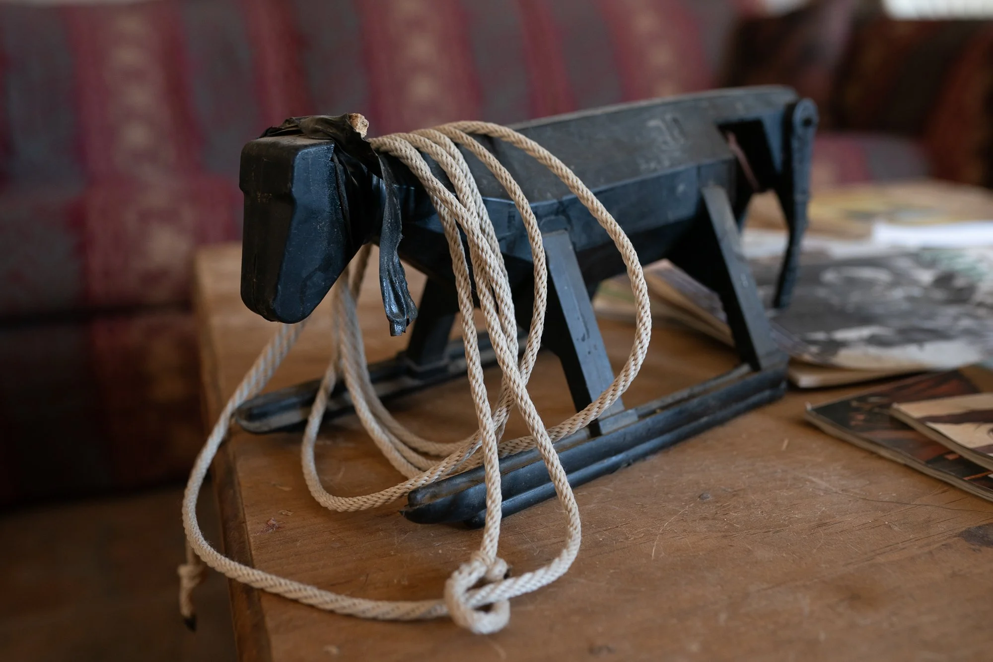 A miniature metal roping dummy sits on the bunkhouse table, used by young buckaroos learning the craft at the C-Punch Ranch.