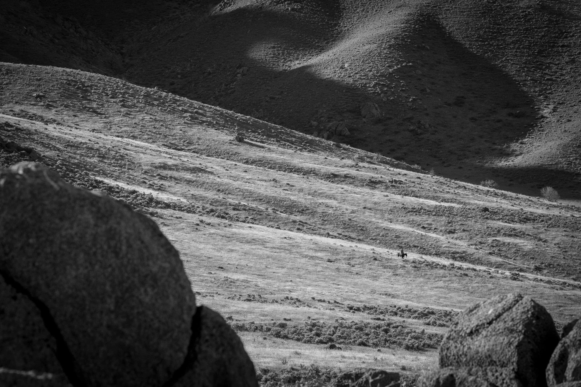 A distant cowboy rides along a sunlit hillside near the C-Punch Ranch, dwarfed by the scale and shadows of the Great Basin.