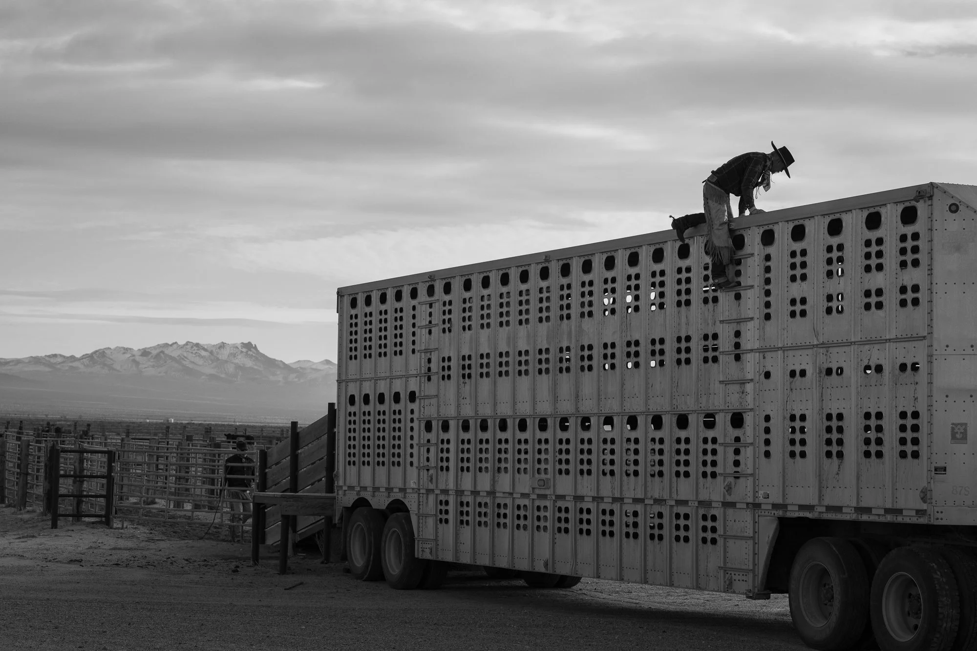 A cowboy climbs a livestock trailer at the C-Punch Ranch as cattle are prepared for shipping across the winter range.