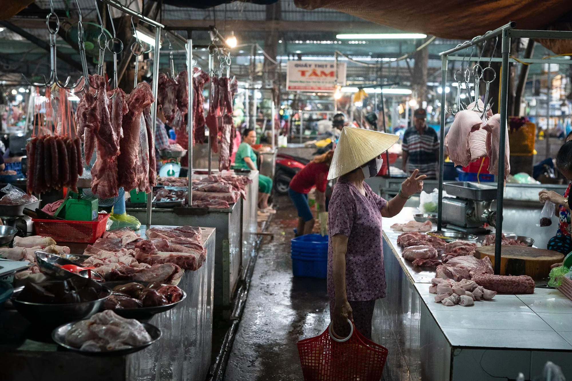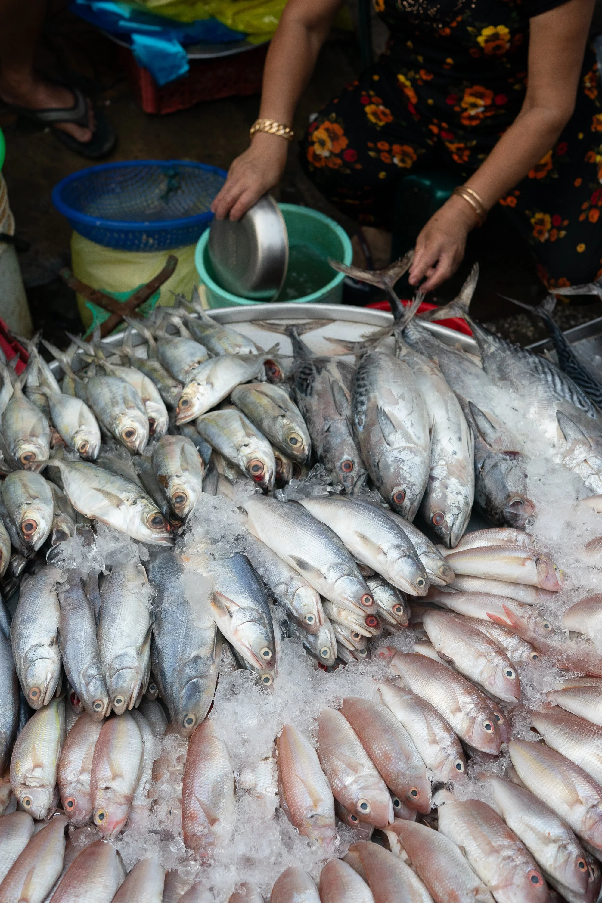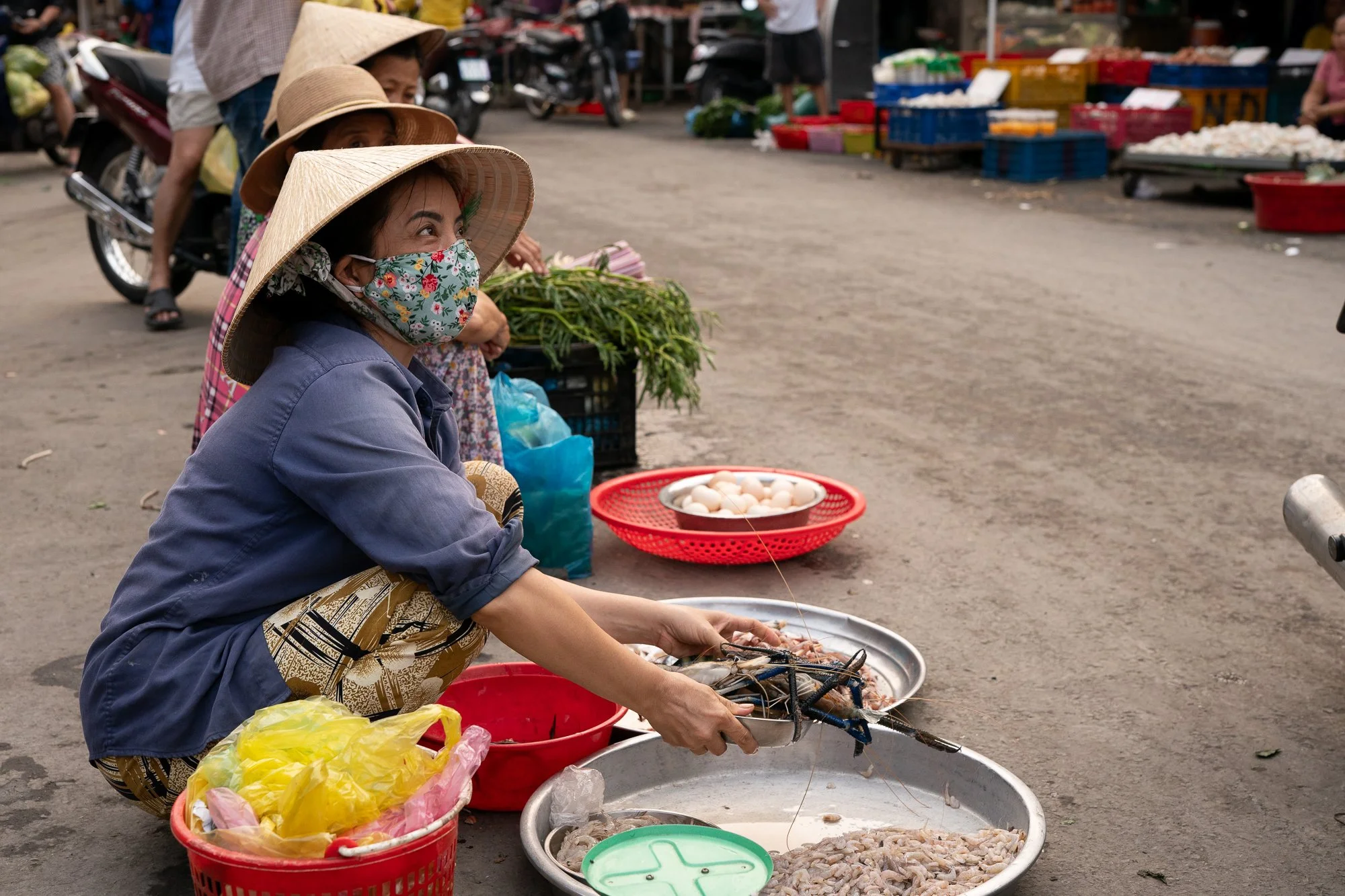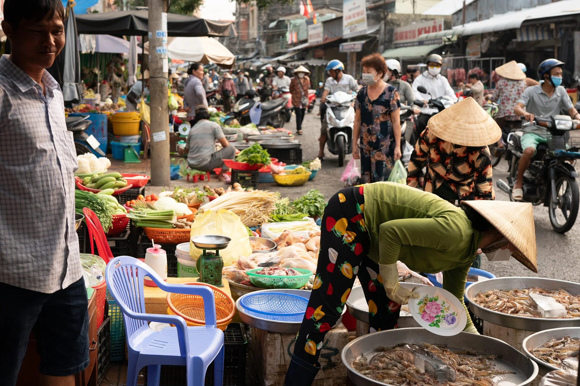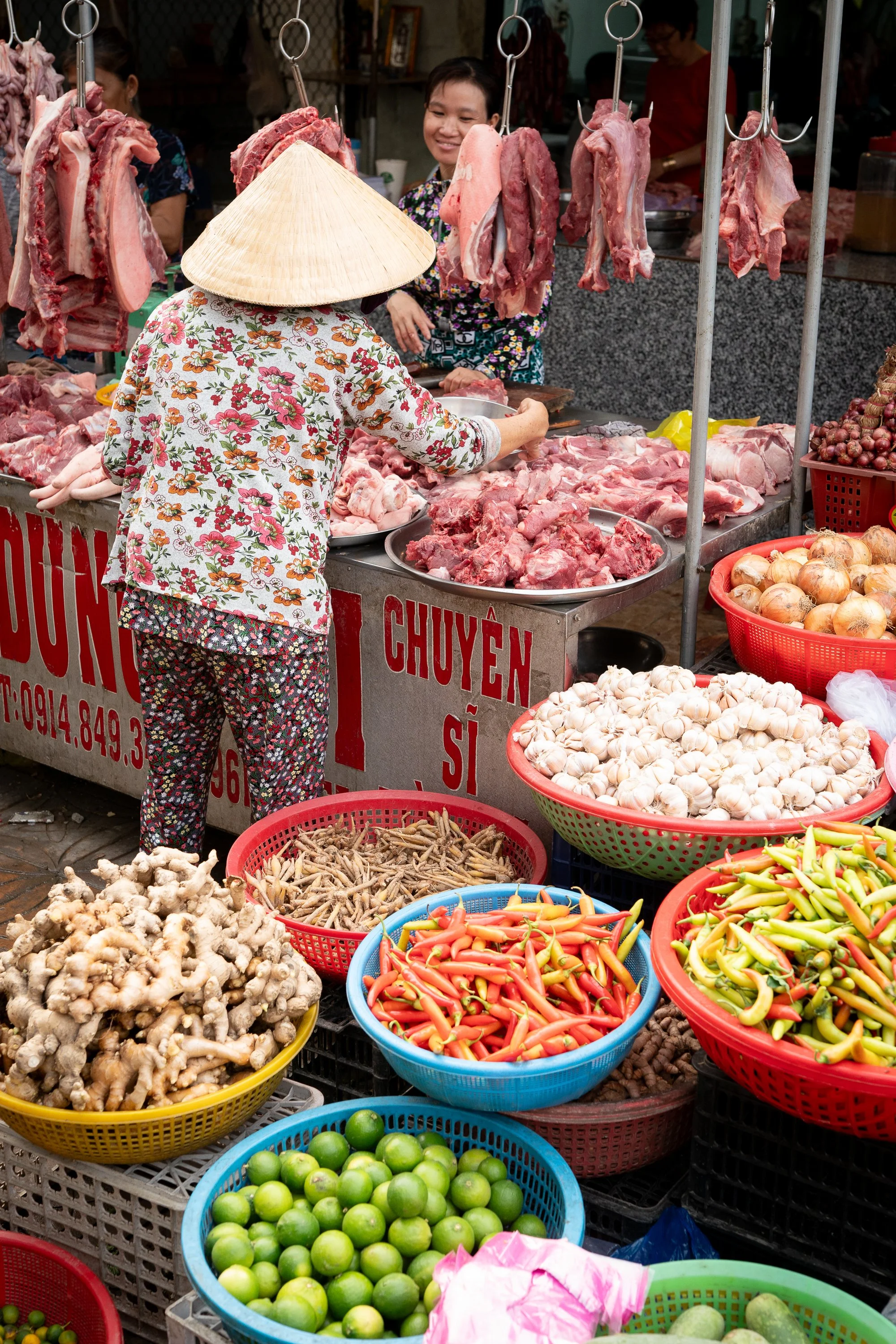 Markets like this are all about details. The textures of weathered hands scooping rice, the metallic shine of fish laid out on woven mats, the soft lines of conical hats leaning in the corner. Light spilled in from gaps between tarps, bouncing off everything—bright oranges, deep greens, pale pinks.