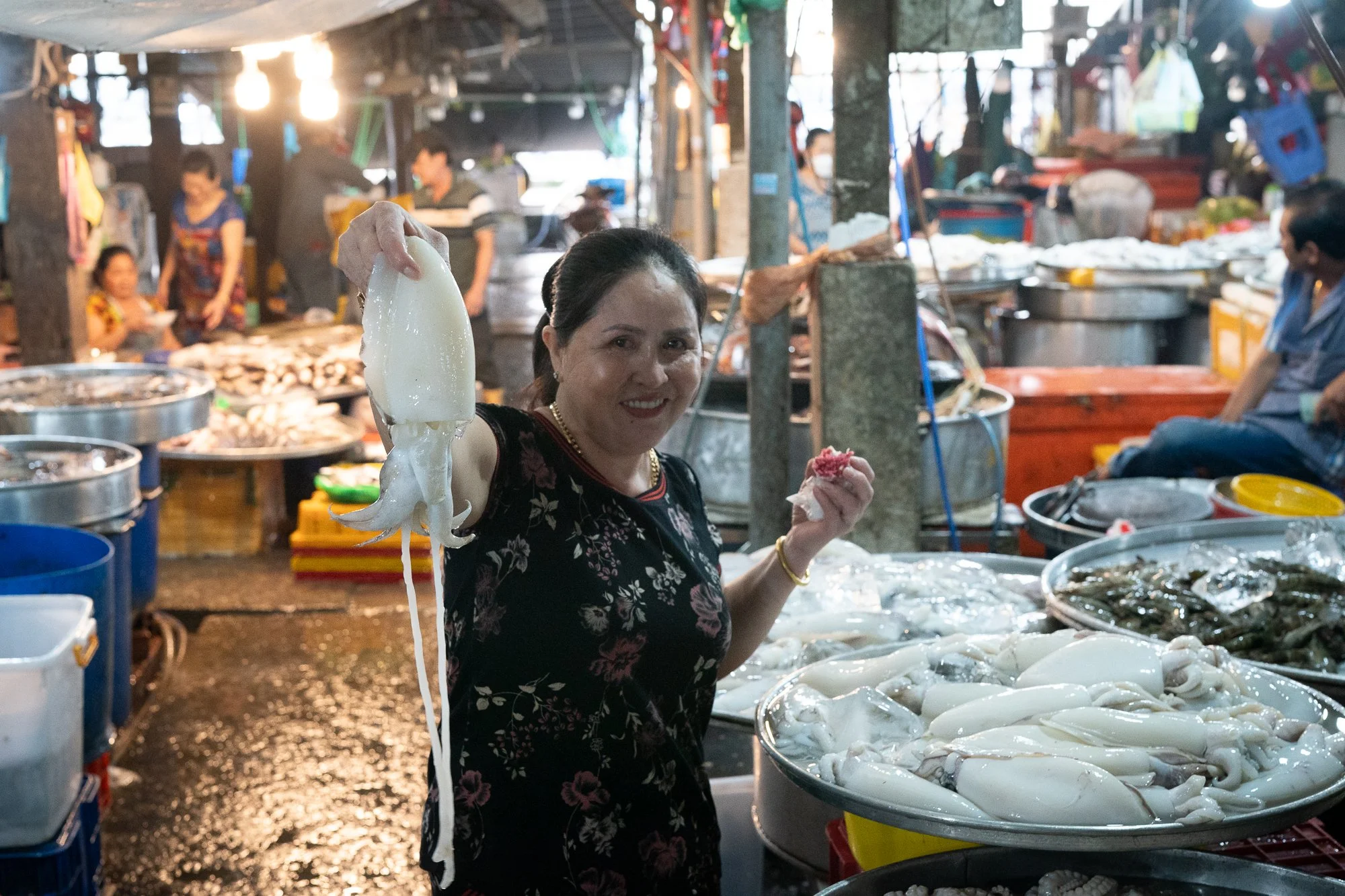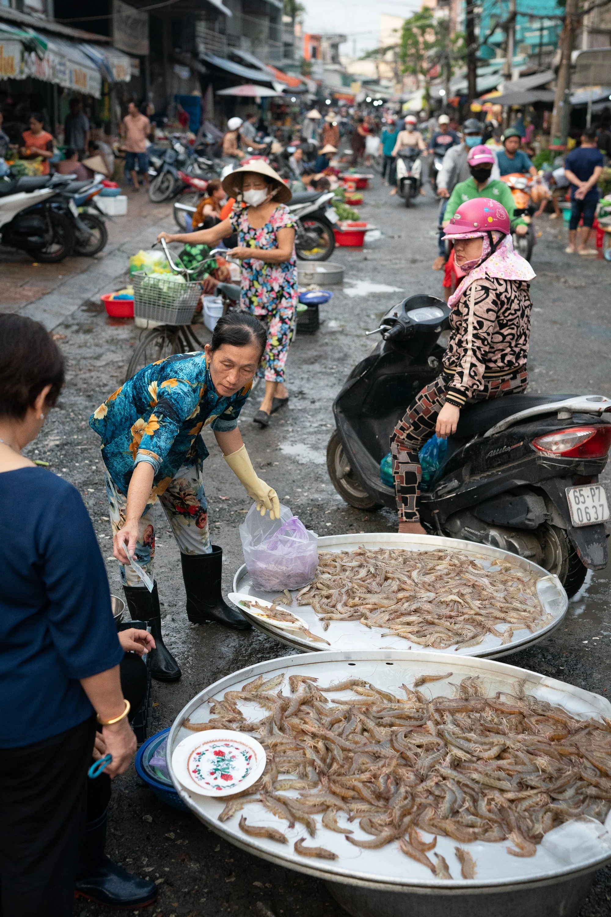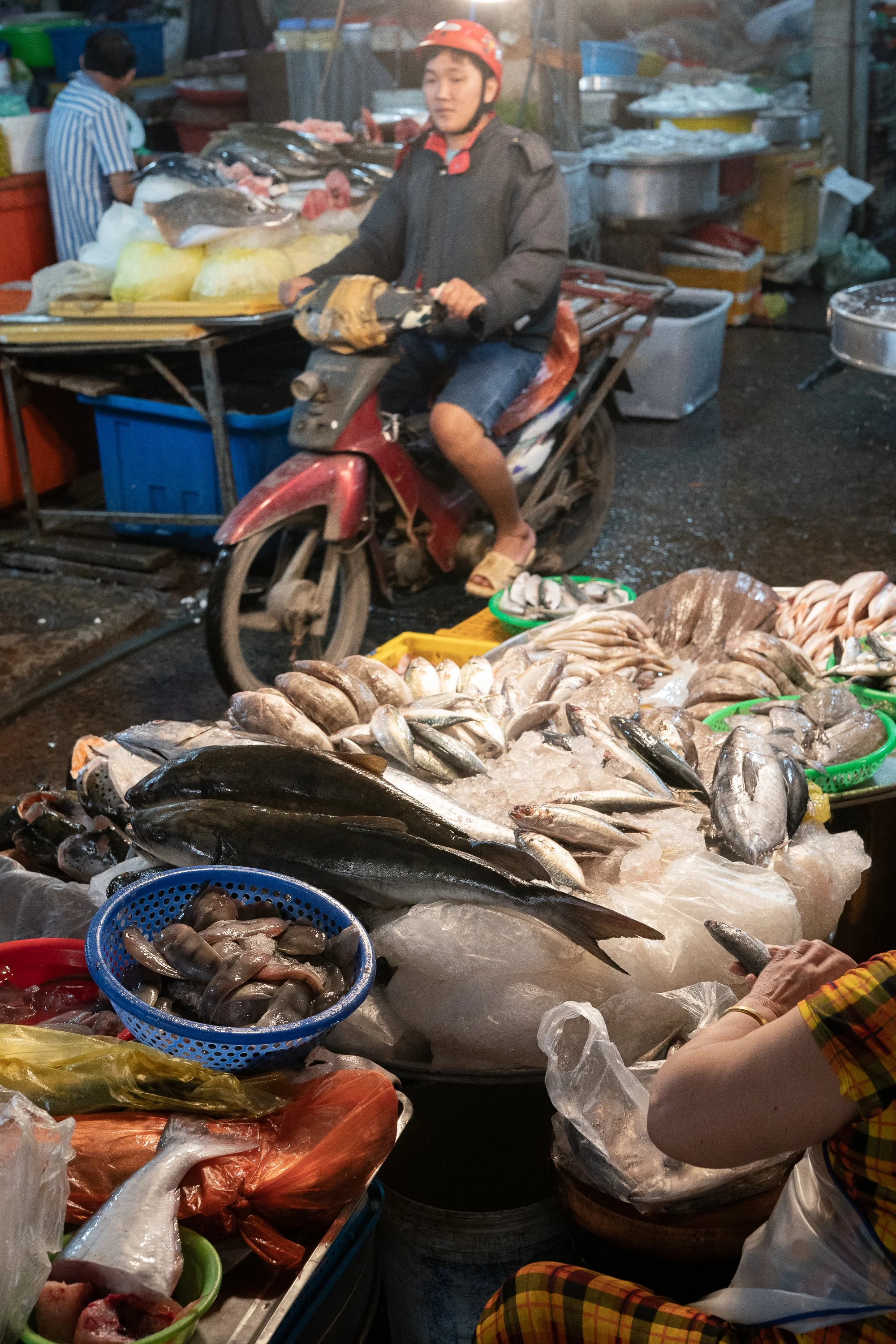 It wasn’t staged for tourists. It wasn’t polished or quiet. It was busy, messy, colorful—and absolutely real. Come to think of it, I can’t remember seeing one other person at the market who wasn’t Vietnamese. As a photographer, that kind of energy is gold. Every direction I turned, there was a new scene unfolding: a pile of dragon fruit glowing under the morning sun, women throwing water on their fish, and scooters weaving through crowds loaded with fresh greens.