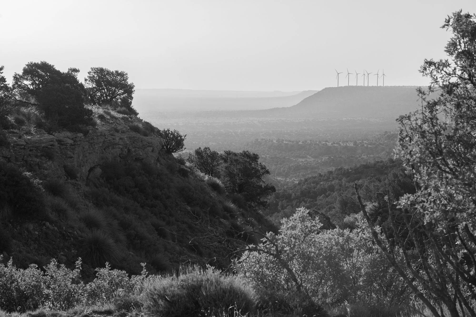 Minimal black and white photograph of a wind farm along the Llano Estacado horizon