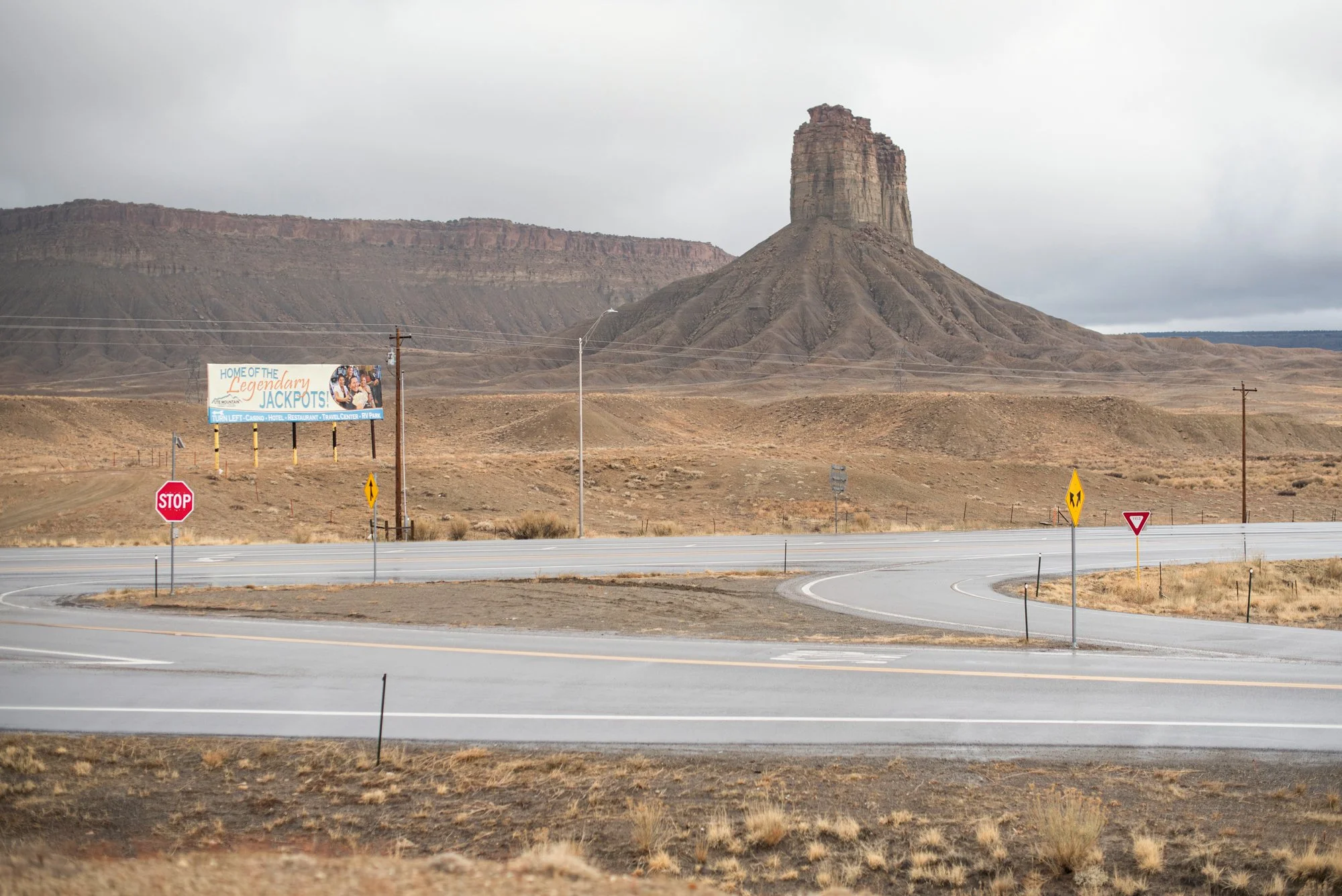 A quiet intersection sits beneath a weathered formation, where signage meets open land.