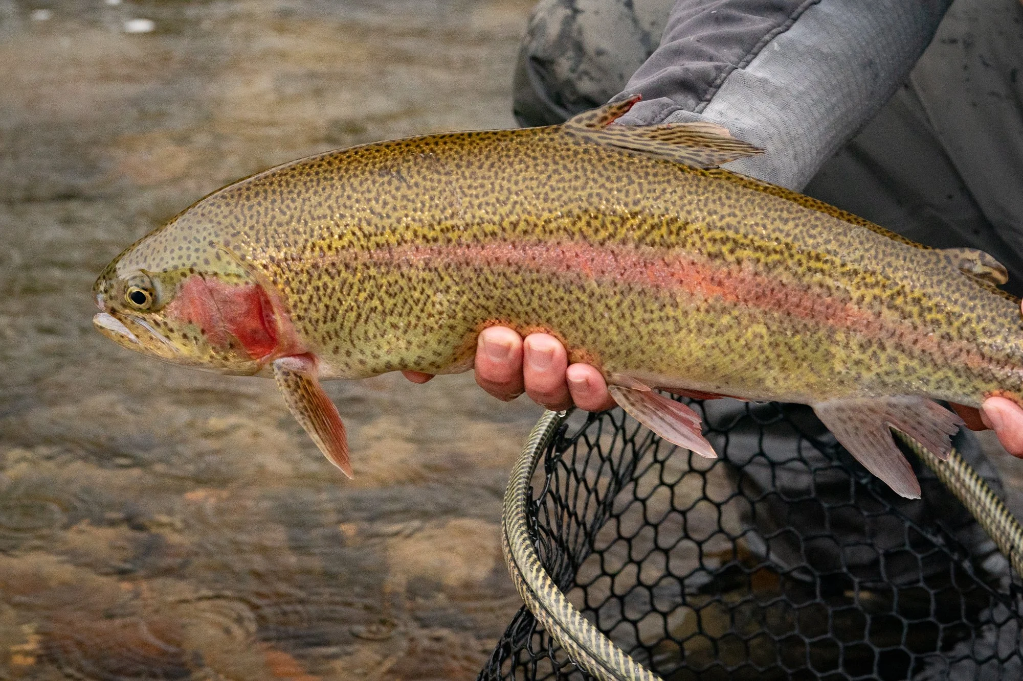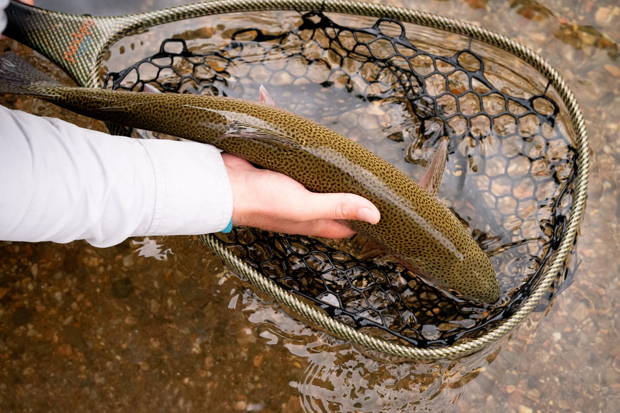 Netting a large Rainbow Trout