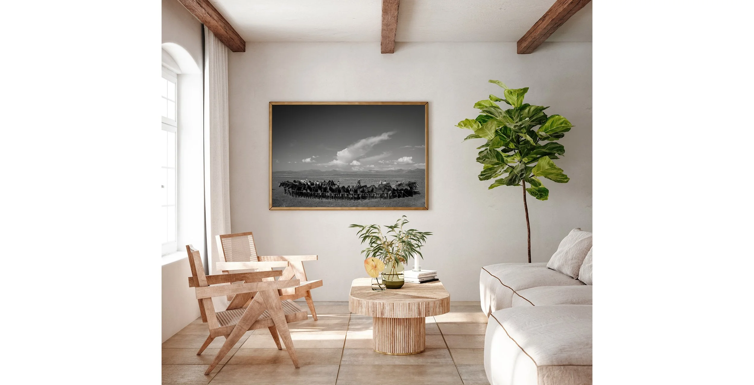 A black and white cowboy photograph displayed in a calm, modern interior—showing how classic Western imagery can live comfortably in a clean, contemporary space.
